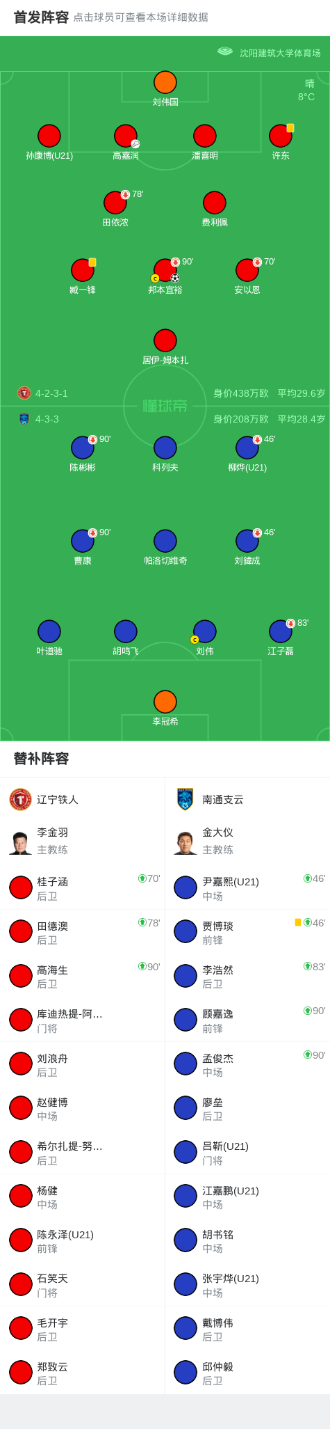 第48分钟,高嘉润传身后,邦本宜裕插上射门得分,辽宁铁人1-0南通支云