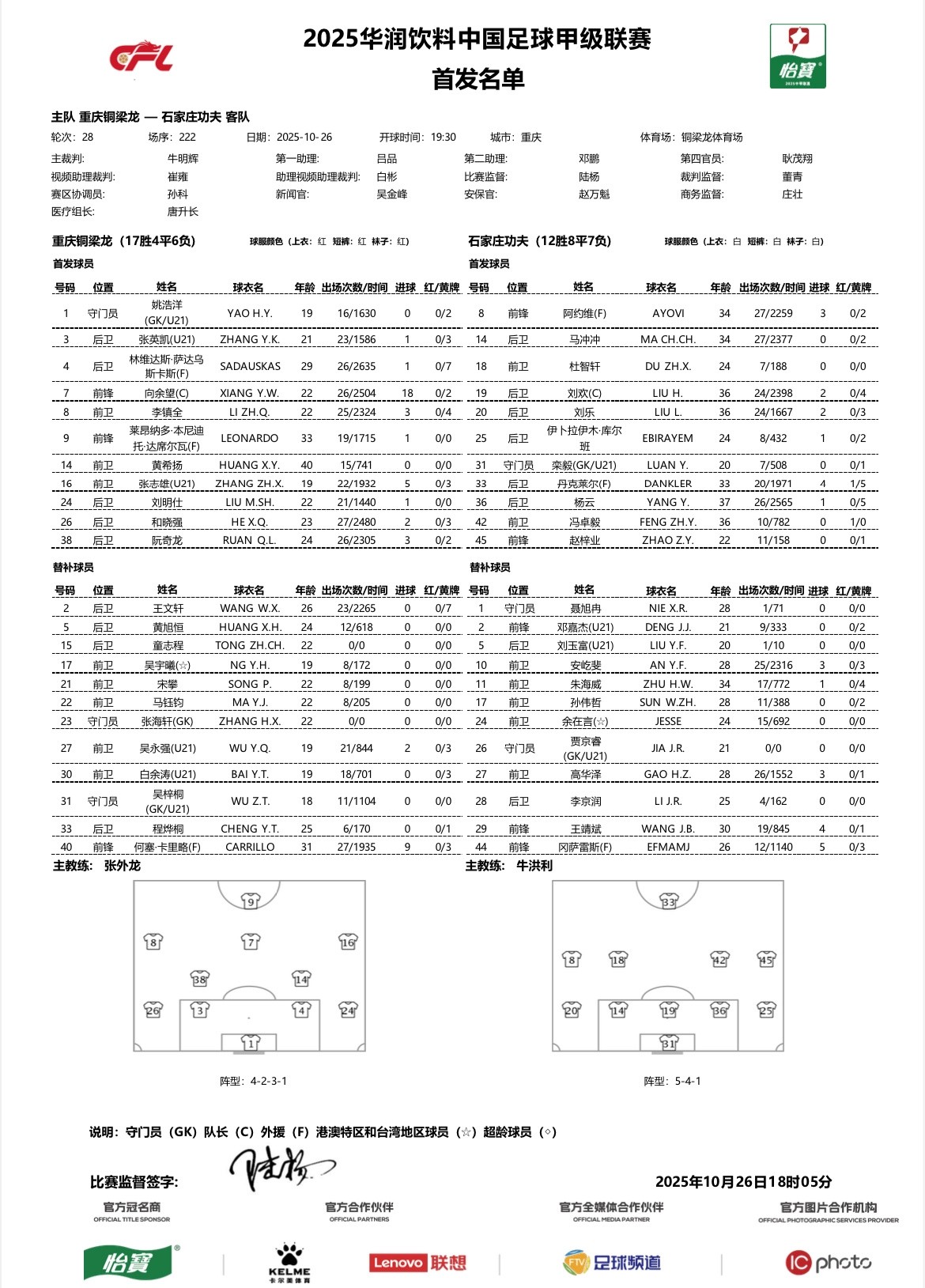 北京时间10月26日19:30,中甲第28轮,重庆铜梁龙主场迎战石家庄功夫。赛前,双方首发公布如下: