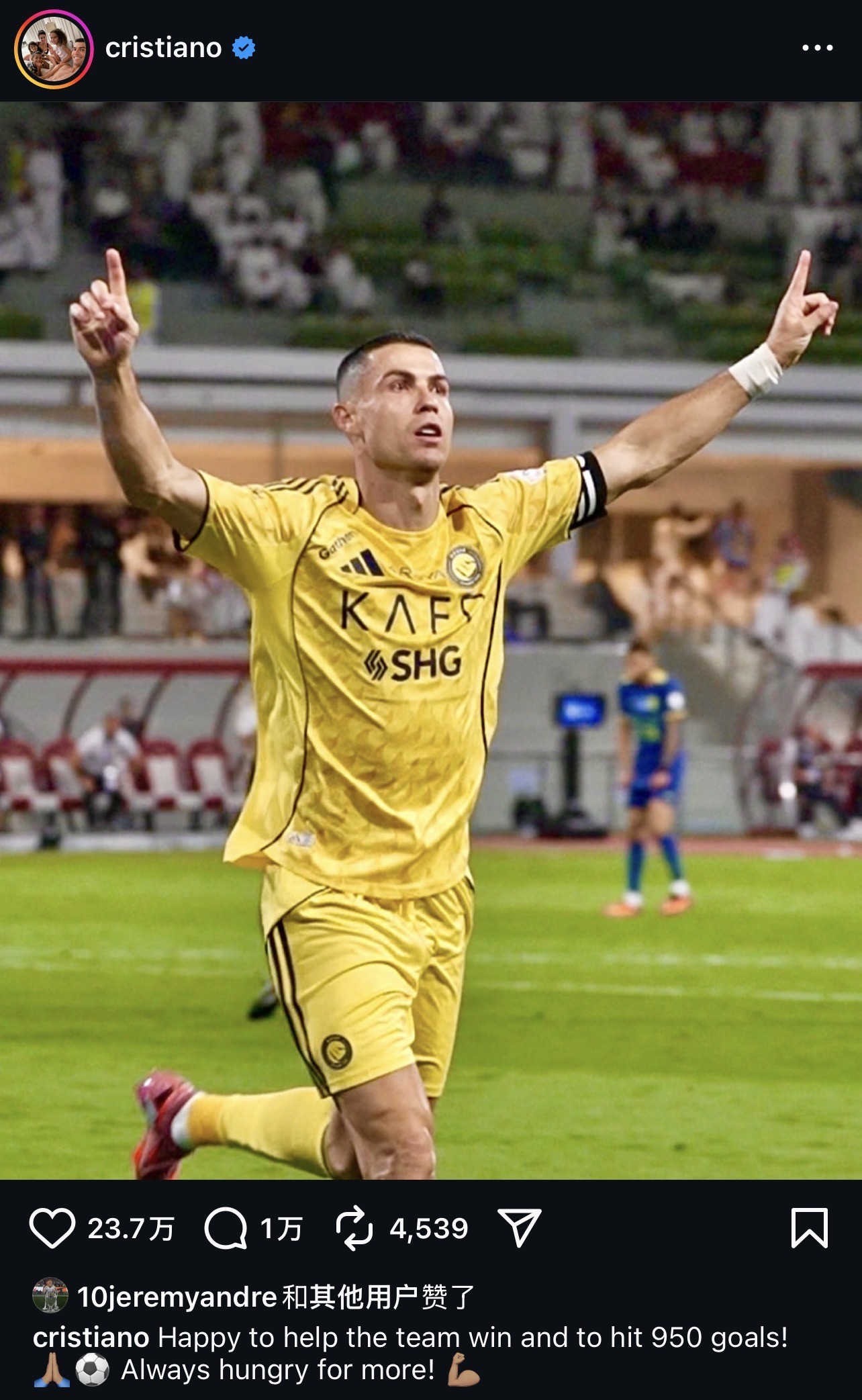 C罗表示:“很高兴能够帮助球队赢球,并且打进第950个进球!🙏🏽⚽️ 永远渴望更多!💪🏽”