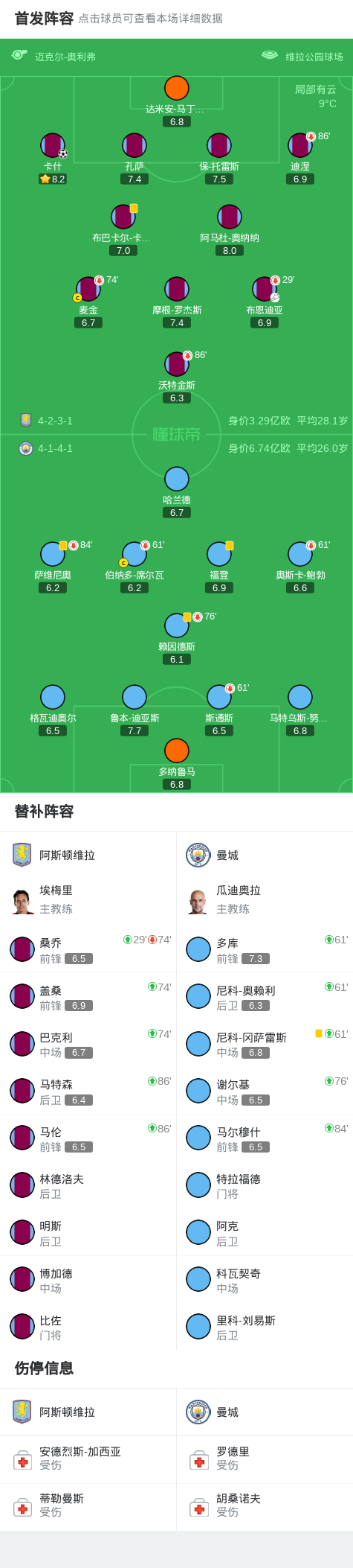 北京时间10月26日22:00,英超第9轮继续进行,曼城作客维拉公园球场挑战阿斯顿维拉,本场主裁判为迈克尔-奥利弗。上半场,卡什轰世界波,布恩迪亚送助攻+伤退。下半场,多纳鲁马屡救险,哈兰德绝平无效。最终,曼城0-1客负维拉。
