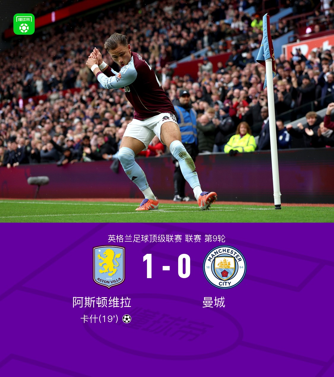 第19分钟,又是世界波!卡什禁区外将球打进反向死角,曼城客场0-1落后维拉