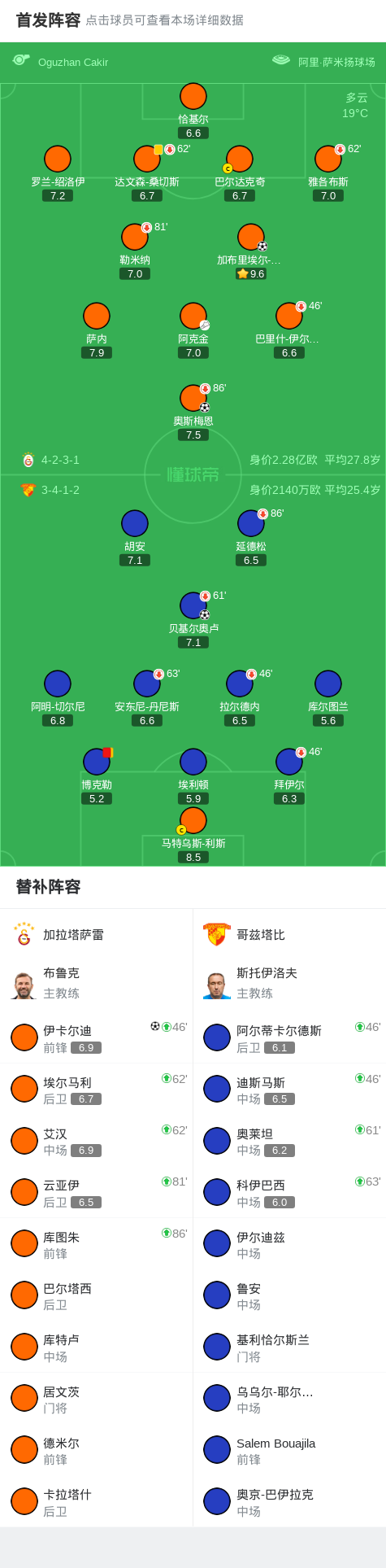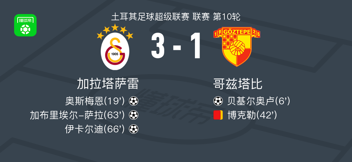 北京时间10月26日土耳其足球超级联赛 联赛 第10轮,加拉塔萨雷主场对阵哥兹塔比。加拉塔萨雷奥斯梅恩破门,加布里埃尔-萨拉破门,伊卡尔迪破门。哥兹塔比贝基尔奥卢破门。最终比分加拉塔萨雷 3–1 哥兹塔比。