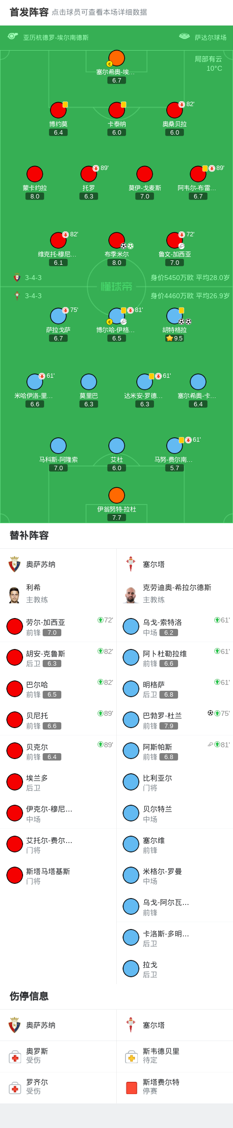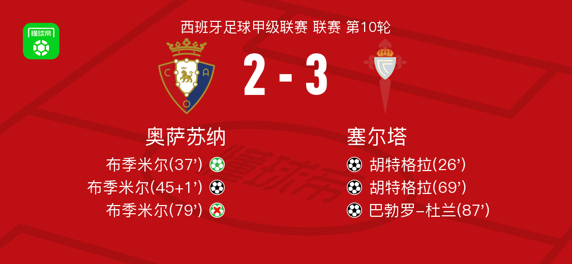 北京时间10月27日,西班牙足球甲级联赛第10轮展开角逐,奥萨苏纳坐镇主场迎战塞尔塔。比赛中,塞尔塔由博尔哈-伊格莱西亚斯助攻胡特格拉率先破门。随后,奥萨苏纳通过点球机会由布季米尔扳平比分。上半场补时阶段,鲁文-加西亚送出助攻,布季米尔再入一球,帮助球队实现反超。进入下半场,胡特格拉再度建功,将比分重新拉回均势。此后,布季米尔主罚点球未能命中,错失再次领先的机会。比赛尾声,阿斯帕斯助攻巴勃罗-杜兰完成绝杀。最终,奥萨苏纳以2比3不敌塞尔塔。