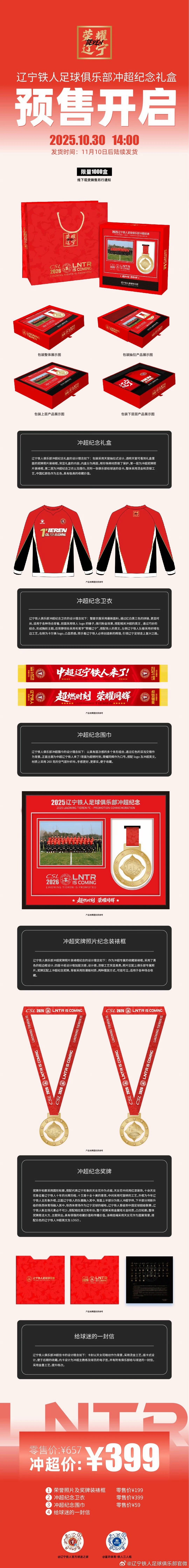 辽宁铁人冲超纪念礼盒将在10月30日14:00开启预售,发货时间为11月10日之后。