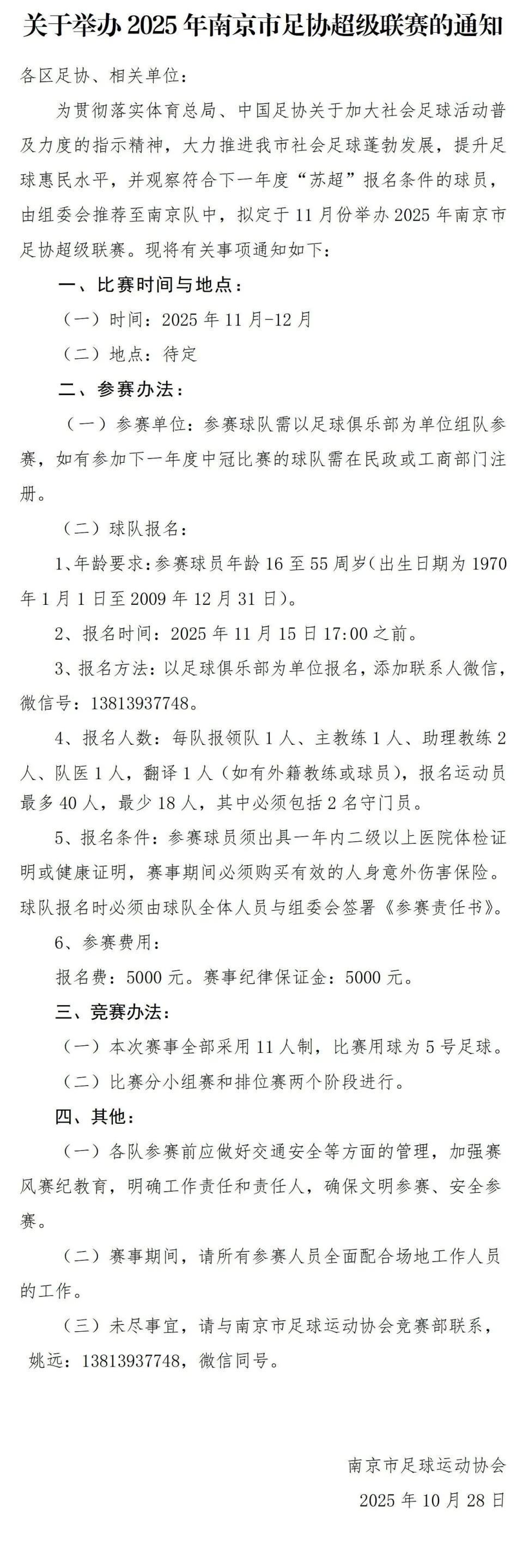 北京时间10月28日,南京市足协官方发布《关于举办2025年南京市足协超级联赛的通知》,考察符合下一年度“苏超”报名条件的球员。