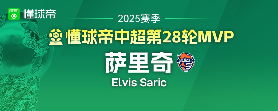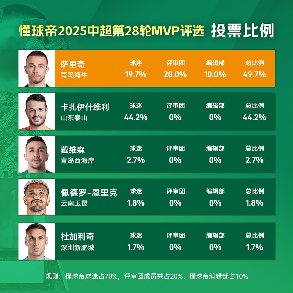 大家好,欢迎来到懂球帝2025赛季中超MVP评选现场。中超第28轮MVP得主出炉,青岛海牛队35岁老将、队长萨里奇凭借在工体的3球1助攻,以5.5%的优势反超山东泰山队的前锋卡扎伊什维利,当选本轮中超的MVP。