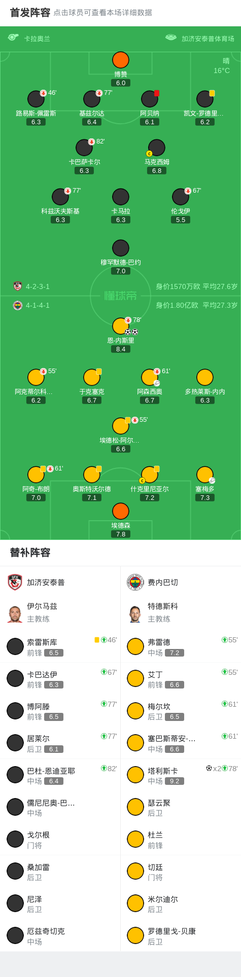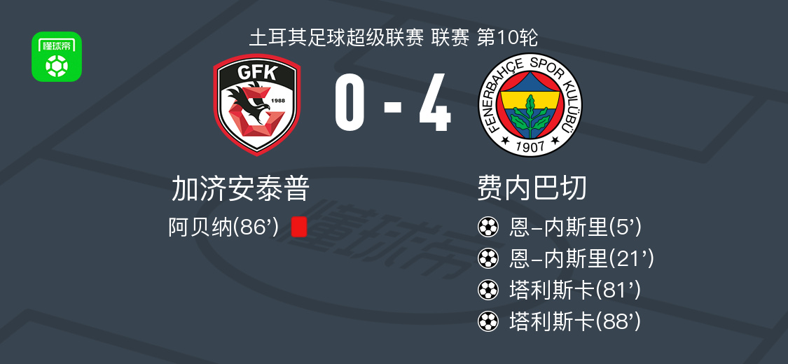 北京时间10月28日土耳其足球超级联赛 联赛 第10轮,加济安泰普主场对阵费内巴切。费内巴切恩-内斯里梅开二度,塔利斯卡梅开二度。最终比分加济安泰普 0–4 费内巴切。