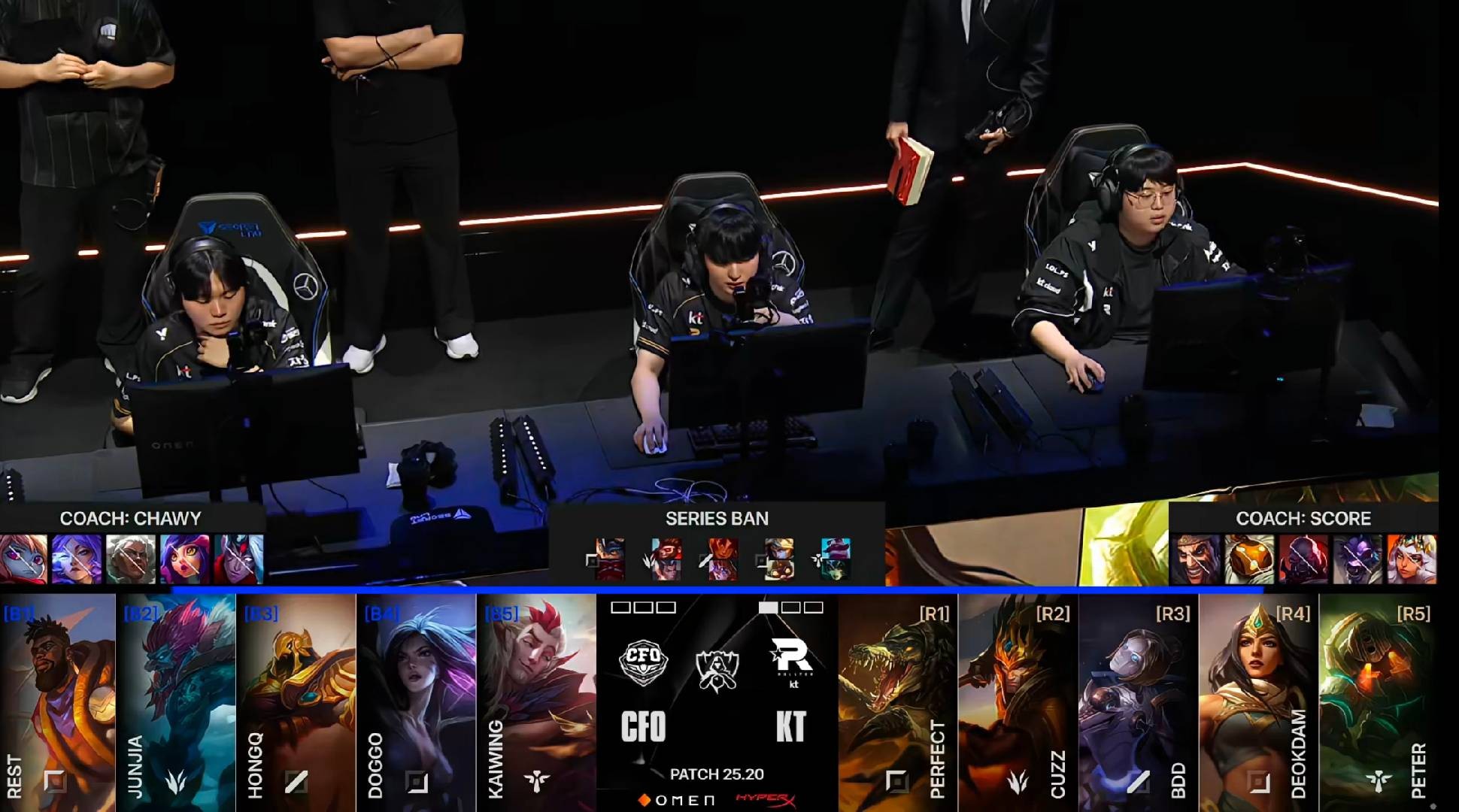 北京时间10月29日,英雄联盟S15世界赛1/4决赛第二场,LCK赛区三号种子KT对阵LCP赛区一号种子CFO。本局CFO上路进行轮换,Rest换下了Driver。本局KT辅助Peter泰坦又在前期起了节奏,连续击杀CFO中路HongQ沙皇,KT又是一场碾压局取胜,2-0拿到赛点。