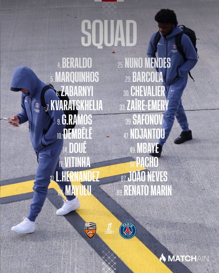 北京时间10月29日,巴黎官方公布布了球队客战洛里昂的大名单,内维斯回归,阿什拉夫、李刚仁缺阵。