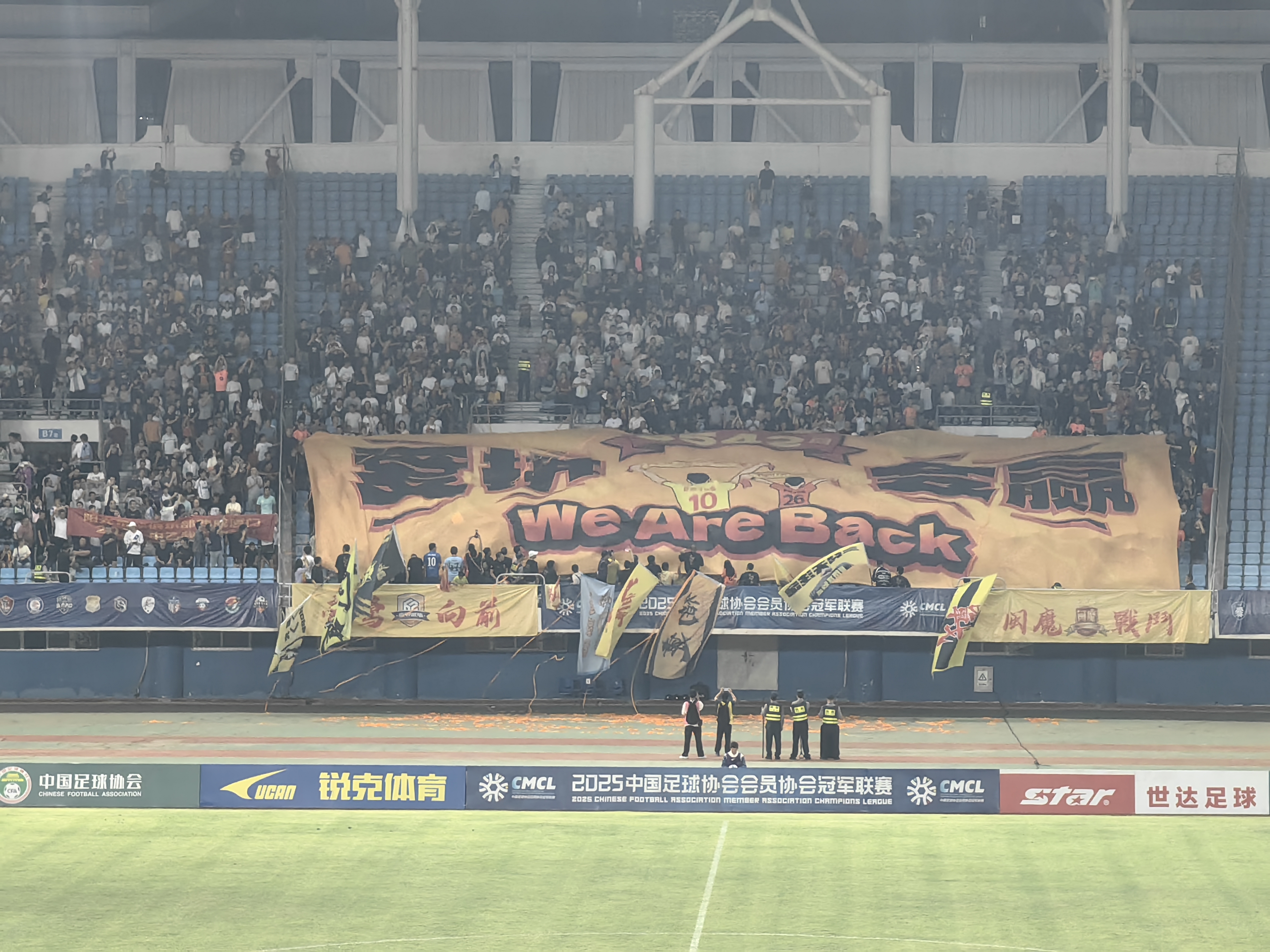 10月26日的厦门市体育中心,到场的厦门球迷在看台上展示了一幅横幅,写着一句醒目的“We are back”(我们回来了)。