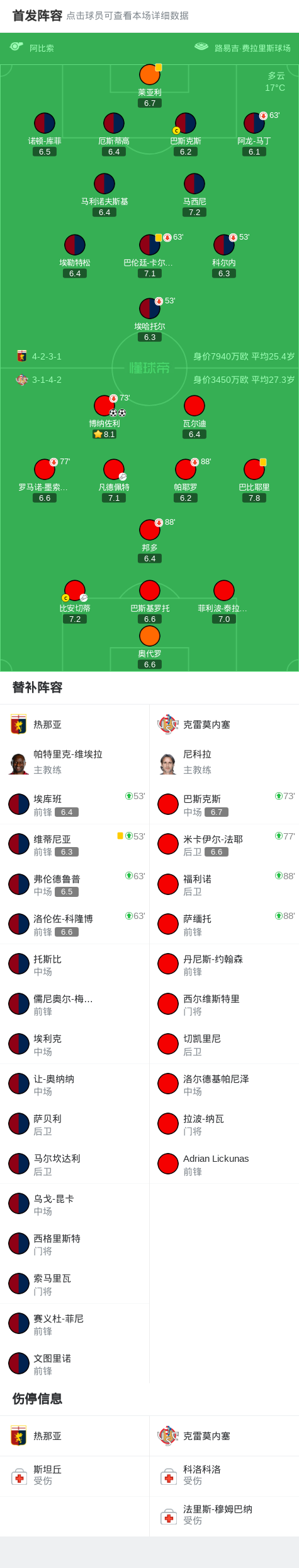 北京时间10月30日,意大利足球顶级联赛第9轮,热那亚主场迎战克雷莫内塞。比赛开局阶段,比安切蒂送出助攻,博纳佐利破门得分,为克雷莫内塞取得领先。下半场易边再战,凡德佩特成功助攻,博纳佐利再入一球,帮助球队扩大优势。此后双方均未能改写比分。最终,热那亚0-2不敌克雷莫内塞。