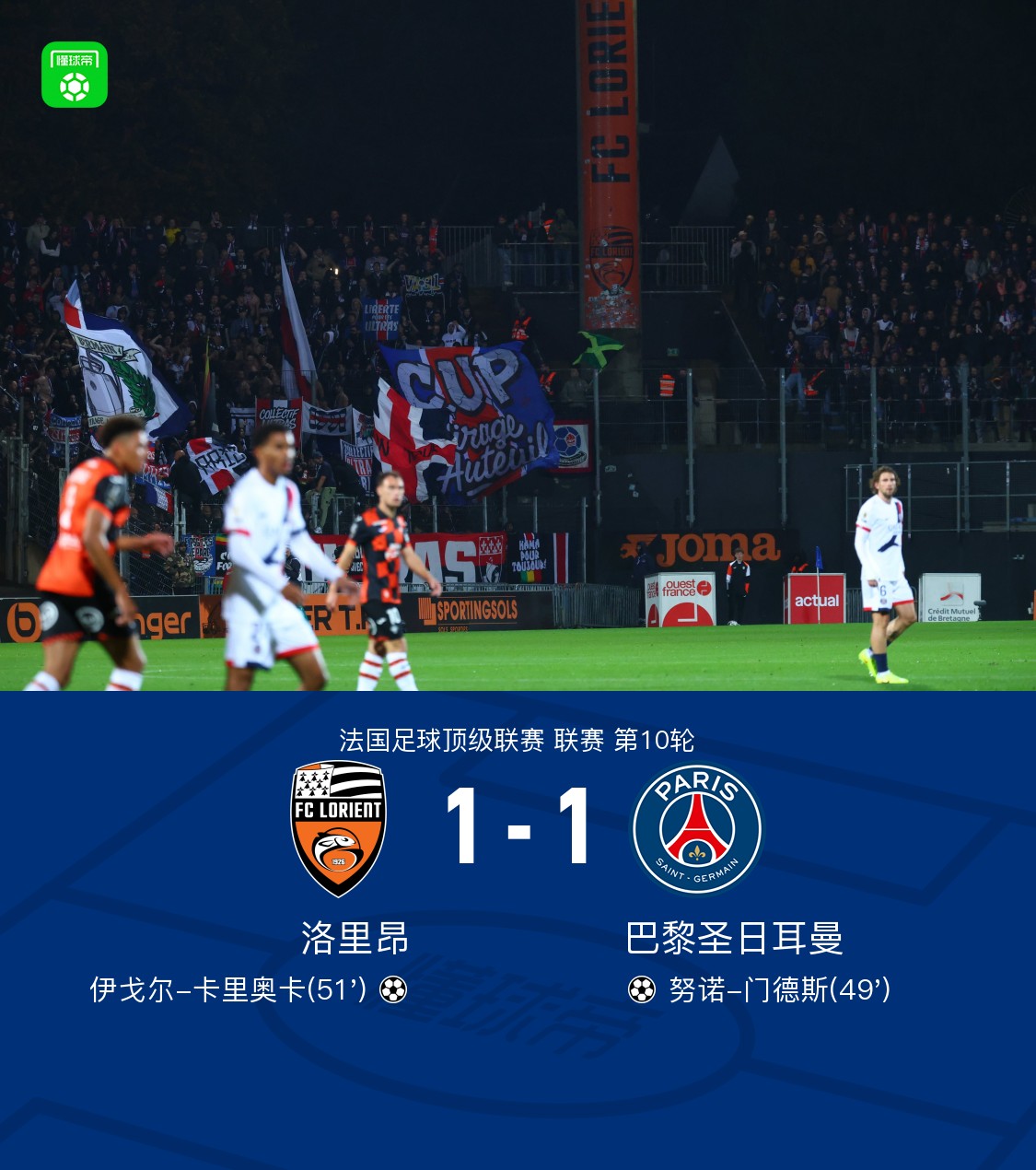 北京时间10月30日,法国足球甲级联赛第10轮展开较量,洛里昂坐镇主场迎战巴黎圣日耳曼。比赛开始后双方均展现出强烈的进攻意愿。巴黎圣日耳曼由努诺-门德斯率先破门,取得领先。落后的洛里昂迅速做出回应,伊戈尔-卡里奥卡攻入一球,帮助球队扳平比分。此后双方均未能改写比分,最终全场结束,洛里昂与巴黎圣日耳曼以1比1握手言和。