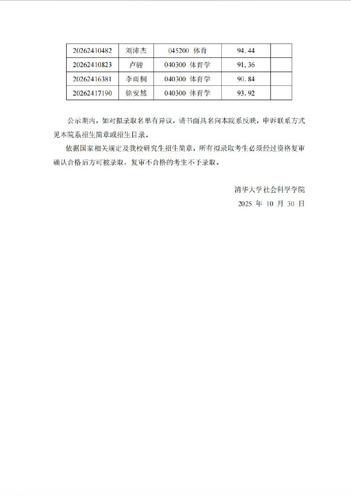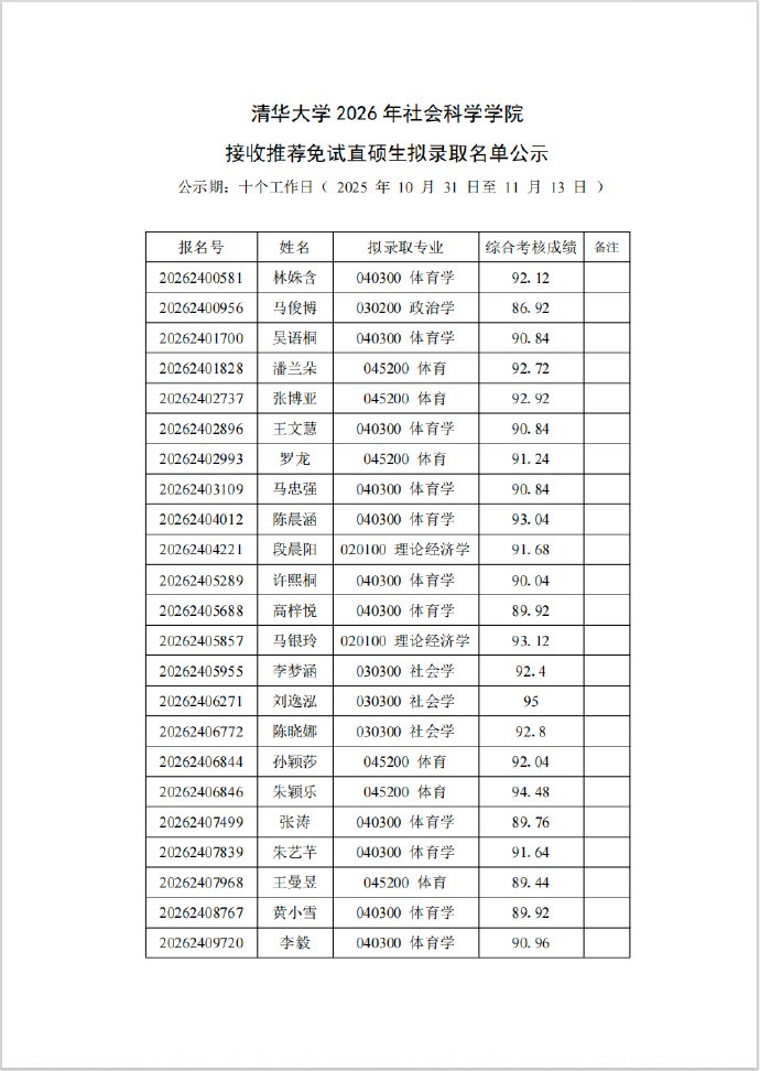 10月30日,据清华大学官网,清华大学公示2026年社会科学学院接收推荐免试直硕生拟录取名单,孙颖莎综合考核成绩92.04分、王曼昱89.44分入选该名单。 文章导航 FIFA发布U17世界杯吉祥物:原型为猫头鹰,其名字向米卢致敬 卡西谈手表被盗:小偷真是蠢货,她觉得我发现不了手表被调包