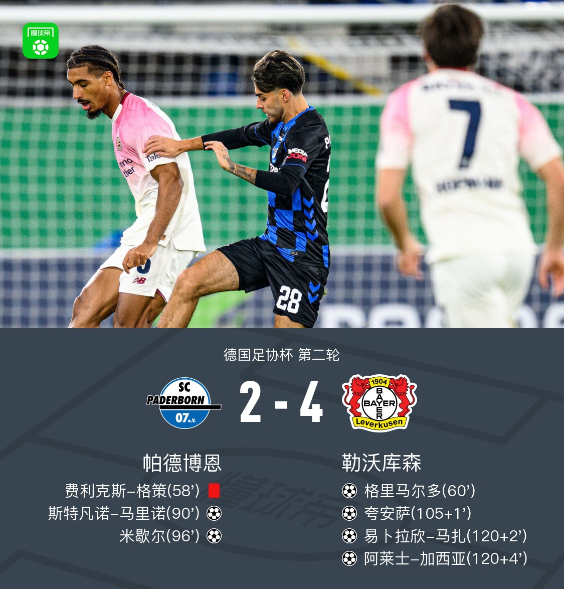 北京时间10月30日德国足协杯 第二轮,帕德博恩对阵勒沃库森。帕德博恩斯特凡诺-马里诺破门,米歇尔破门。勒沃库森格里马尔多破门,夸安萨破门,易卜拉欣-马扎破门,阿莱士-加西亚破门。最终比分帕德博恩 2–4 勒沃库森。