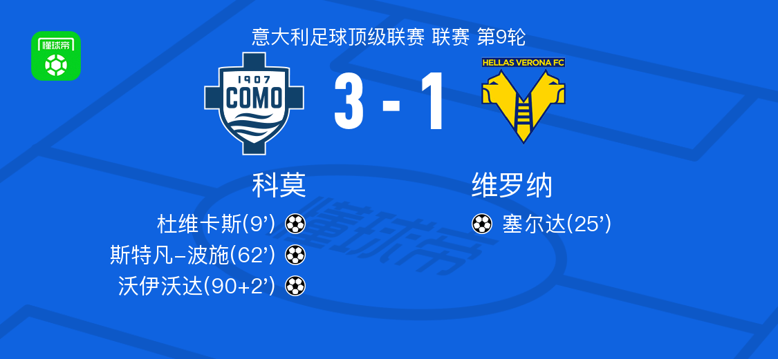 北京时间10月30日,意大利足球顶级联赛第9轮,科莫坐镇主场迎战维罗纳。比赛开局阶段,阿莱士-巴列送出精准助攻,杜维卡斯冷静施射破门,为科莫取得领先。此后维罗纳展开反击,塞尔达抓住机会扳平比分,双方在上半场形成均势。进入下半场,科莫持续施压,卡克雷送出关键传球,斯特凡-波施接球后果断破门,帮助球队再度领先。比赛临近结束,赫苏斯-罗德里格斯在补时阶段送出绝杀助攻,沃伊沃达破门锁定胜局。最终,科莫以3比1战胜维罗纳,全取三分。