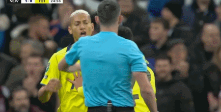 第25分钟,里沙利松对判罚表示异议,裁判出示黄牌对其警告
