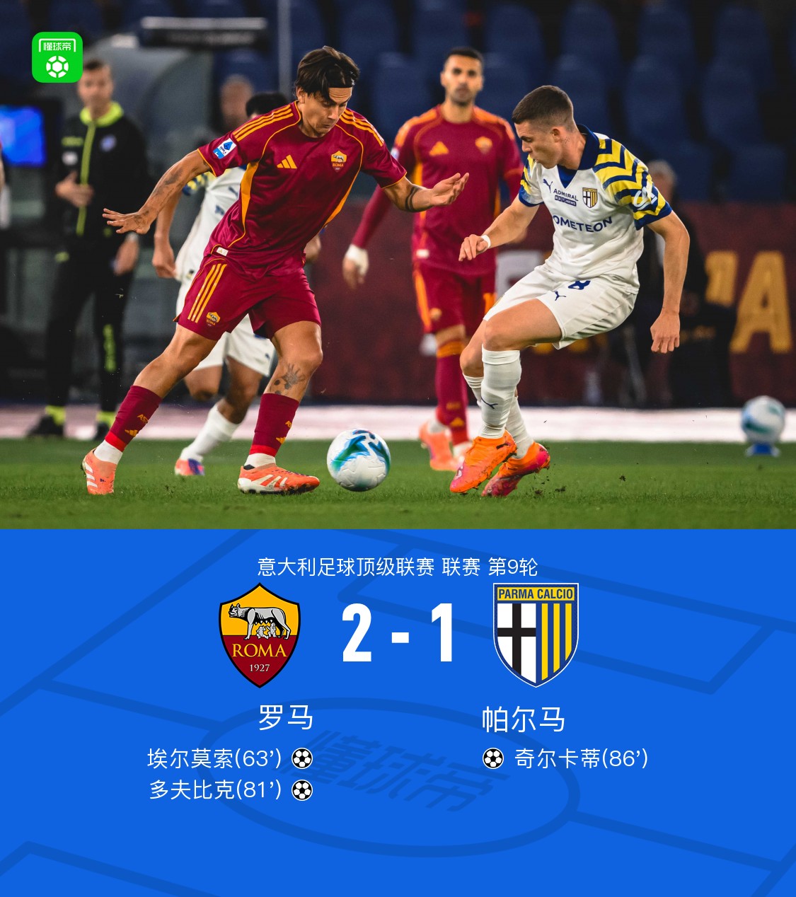 北京时间10月30日,意大利足球顶级联赛第9轮,罗马主场对阵帕尔马。比赛中,埃尔莫索、多夫比克先后破门。奇尔卡蒂为帕尔马扳回一城。最终比分罗马2–1帕尔马。