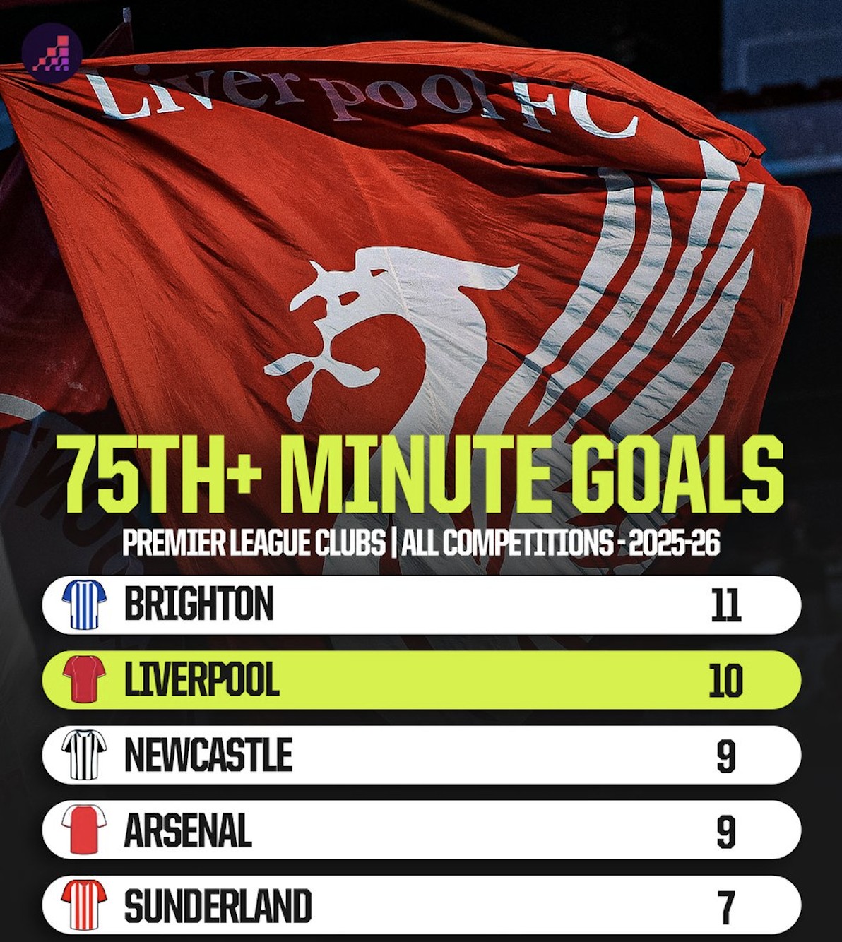 Opta列出了本赛季英超球队各项赛事第75分钟后进球榜,布莱顿11球居首,利物浦10球位列第二。 本赛季英超球队各项赛事第75分钟及以后进球排行榜 1 布莱顿 11球 2 利物浦 10球 3 纽卡斯尔联 9球 3 阿森纳 9球 5 桑德兰 7球 文章导航 弗兰克:库卢还无法进行草地训练;高井幸大股四头肌有问题 成都1-2河南赛中,阿奇姆彭遭看台球迷竖中指+骂黑鬼