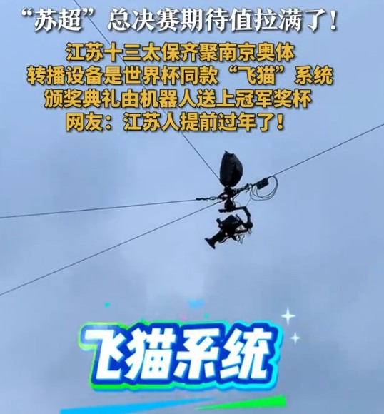 据悉,“苏超”总决赛的转播设备是世界杯同款“飞猫”系统,采用世界杯同款转播技术,配备飞猫索道摄像系统与索尼4K-HDR摄像机,构建地空协同的立体转播矩阵。智能追踪技术精准锁定球员动态,多维度视角让观众自由切换全景、战术与特写镜头。此外决赛的颁奖典礼将由机器人送上冠军奖杯。