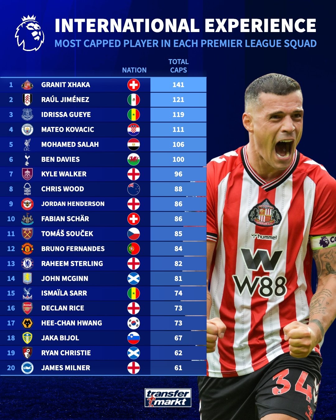 本赛季英超20家俱乐部各自国家队出场数最多球员: