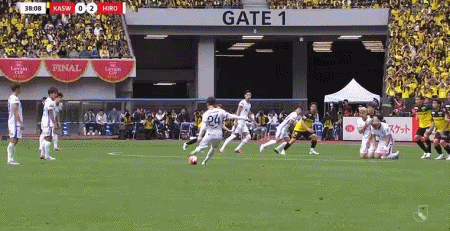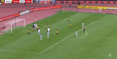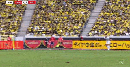 第25分钟,大力手抛球至禁区,荒木隼人头球破门,广岛三箭1-0柏太阳神