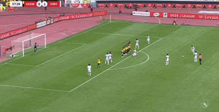 第38分钟,东俊希任意球直接破门,广岛三箭2-0柏太阳神