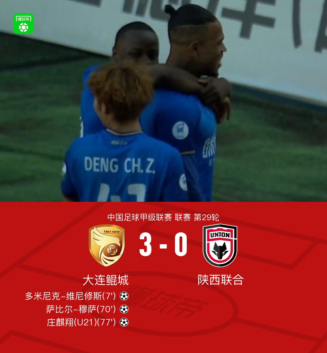 北京时间11月1日,2024赛季中国足球甲级联赛第29轮,大连鲲城坐镇主场迎战陕西联合。上半场穆谢奎将球回做,多米尼克抽射破门。下半场穆谢奎倒钩射门被扑出,萨比尔补射破门,之后崔明安助攻庄麒翔破门。最终大连鲲城3-0战胜陕西联合。
