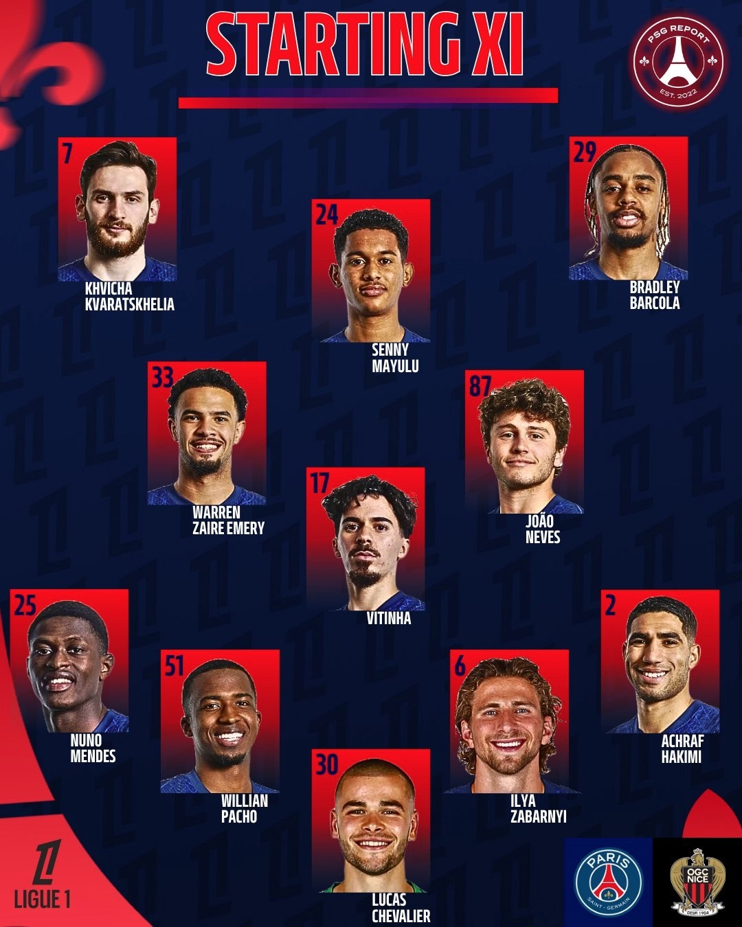 北京时间11月2日0:00,法甲第11轮,巴黎主场迎战尼斯。赛前,双方首发公布如下: