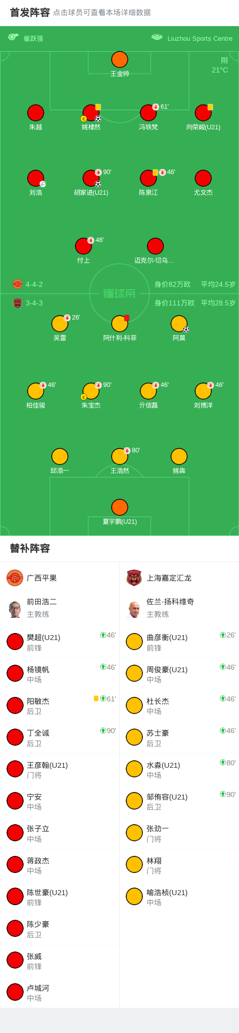 北京时间11月1日中国足球甲级联赛 联赛 第29轮,广西平果主场对阵上海嘉定汇龙。广西平果胡家进破门,姚棣然破门。上海嘉定汇龙阿莫破门。最终比分广西平果 2–1 上海嘉定汇龙。