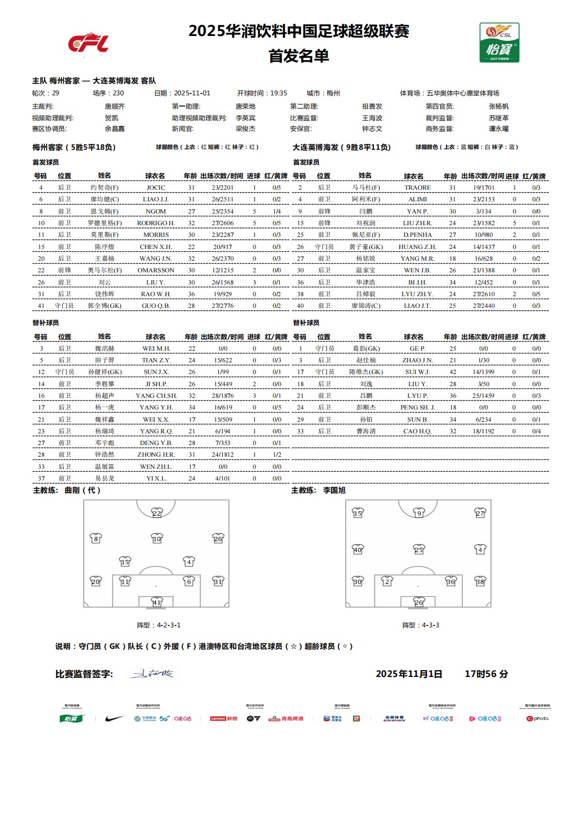 北京时间11月1日,中超联赛第29轮,梅州客家坐镇主场迎战大连英博,本场比赛主裁判还是唐顺齐,VAR是贺凯,赛事双方公布首发:
