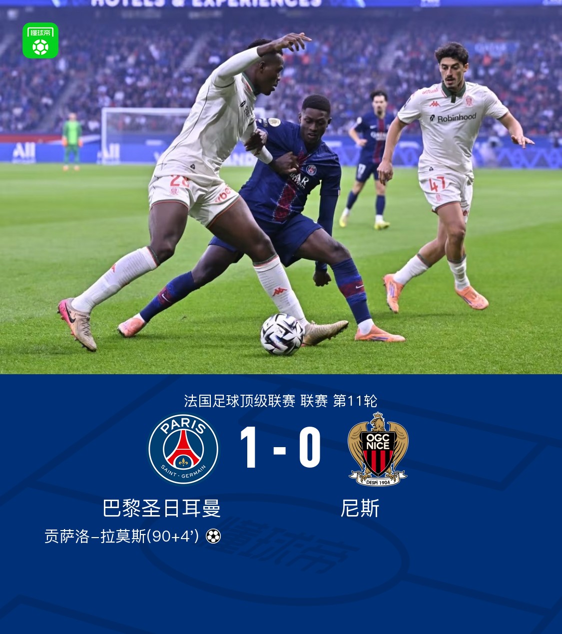 北京时间11月2日,法国足球甲级联赛第11轮,巴黎圣日耳曼坐镇主场迎战尼斯。上半场,克瓦拉茨赫利亚贡献门线解围;下半场比赛补时阶段,贡萨洛-拉莫斯读秒破门,为球队攻入制胜一球。凭借此粒进球,巴黎圣日耳曼以1-0战胜对手,全取三分。