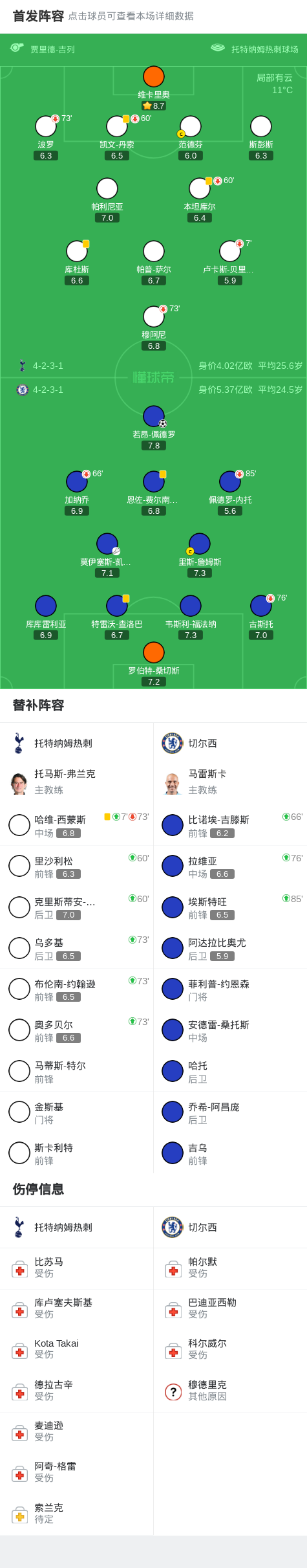 第7分钟,贝里瓦尔无法坚持,被哈维-西蒙斯换下
