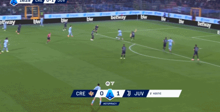 第83分钟,后场长传,瓦尔迪扛开防守低射破门,克雷莫内塞1-2尤文