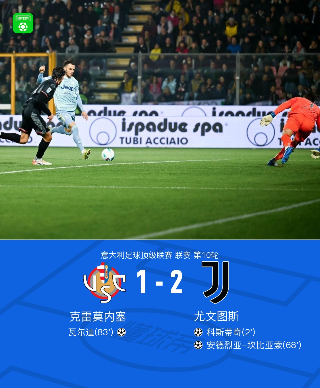 第68分钟,坎比亚索补射破门将比分扩大,尤文2-0克雷莫内塞
