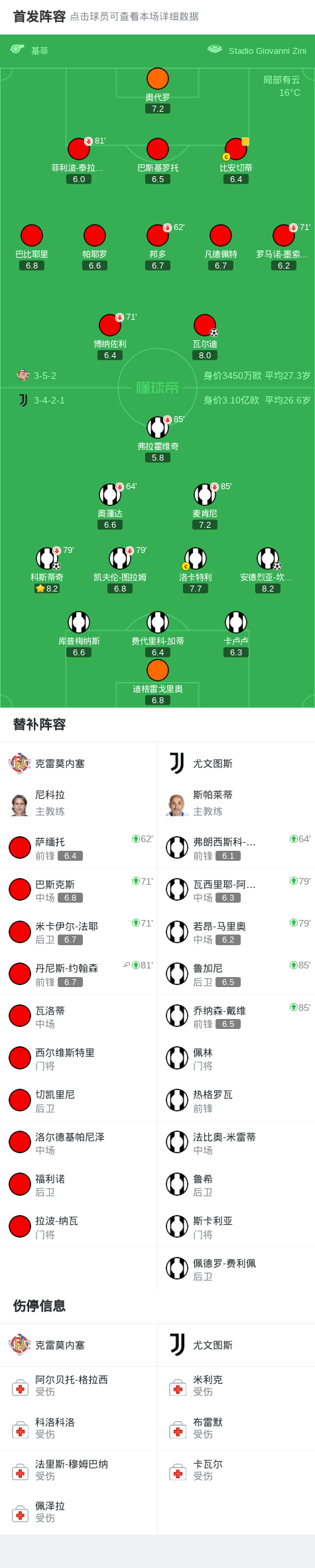 第2分钟,闪电开局,科斯蒂奇后点插上推射破门,尤文1-0克雷莫内塞