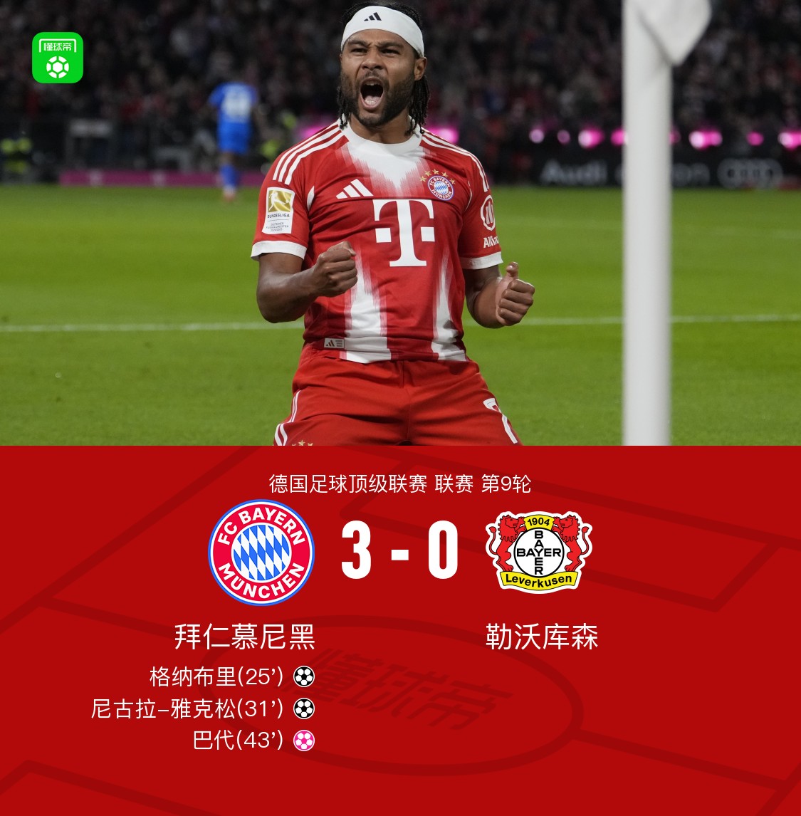 北京时间11月2日,德甲联赛第9轮,拜仁慕尼黑主场迎战勒沃库森。比赛中,比朔夫送出助攻,格纳布里接球后冷静施射破门,为拜仁取得领先。随后莱默尔精准传球,尼古拉-雅克松把握机会再下一城。比赛进入上半场尾声阶段,勒沃库森球员巴代不慎将球打入自家球门,拜仁扩大比分优势。最终全场比赛结束,拜仁慕尼黑以3:0战胜勒沃库森。