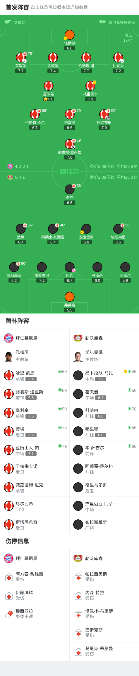 第56分钟,勒沃库森连换三人,霍夫曼、泰里耶、科法内替补登场