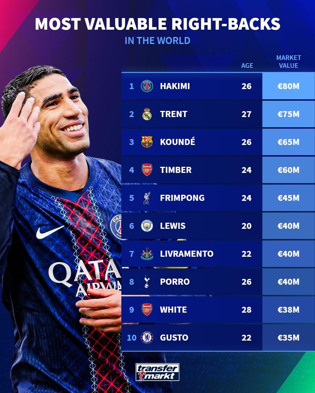 在完成最新一次身价更新后,德国转会市场网站列出了世界足坛右后卫身价排行榜,阿什拉夫8000万欧居首,阿诺德7500万欧位列第二。