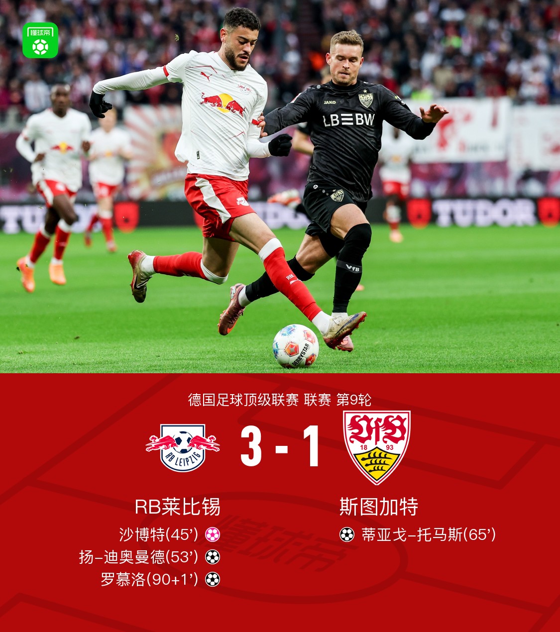 北京时间11月1日,德国足球甲级联赛第9轮,RB莱比锡坐镇主场迎战斯图加特。比赛上半场,斯图加特球员沙博特不慎自摆乌龙,为RB莱比锡取得领先。易边再战,鲍姆加特纳送出助攻,扬-迪奥曼德接球后冷静破门,进一步扩大比分。随后,卢卡-雅克为蒂亚戈-托马斯创造机会,后者将球送入网窝,帮助斯图加特扳回一城。临近结束,罗慕洛在补时阶段抓住机会打入一球,锁定胜局。最终,RB莱比锡以3比1战胜斯图加特。