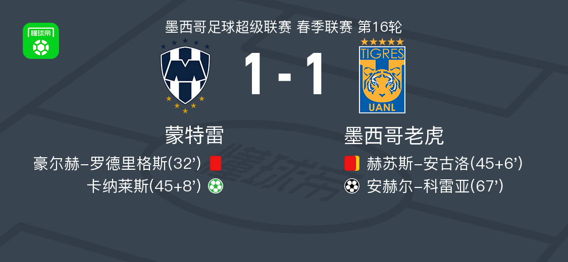 北京时间11月2日墨西哥足球超级联赛 春季联赛 第16轮,蒙特雷主场对阵墨西哥老虎。蒙特雷卡纳莱斯破门。墨西哥老虎安赫尔-科雷亚破门。最终比分蒙特雷 11 墨西哥老虎。