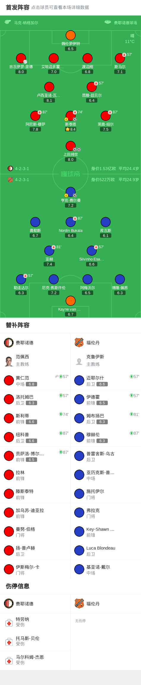 北京时间11月2日,荷兰甲级联赛第11轮,费耶诺德坐镇主场迎战福伦丹。比赛中,吉瓦伊罗-里德送出助攻,上田绮世接球后冷静破门,为费耶诺德先拔头筹。随后斯泰恩抓住机会再下一城,帮助球队扩大领先优势。易边再战,福伦丹由亨克-费尔曼远射得手,扳回一球。比赛末段,黄仁范精准传球助攻,上田绮世再度破门完成梅开二度。最终,费耶诺德以3比1战胜福伦丹。