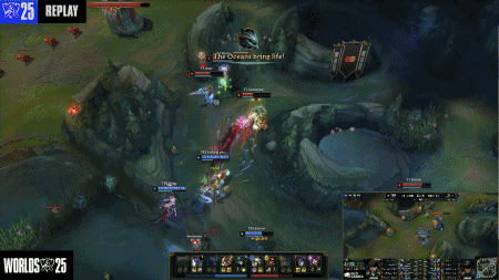 第21分钟,厄塔汗坑附近,Keria妮蔻开到TES三人,Doran青钢影大招锁JackeyLove飞机,Faker加里奥跟上大招将其秒掉,Gumayusi卡莎砍下一波三杀,T1收下厄塔汗;