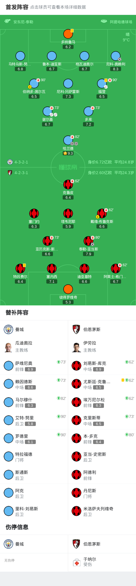北京时间11月3日英格兰足球顶级联赛 联赛 第10轮,曼城主场对阵伯恩茅斯。曼城哈兰德梅开二度,尼科-奥赖利破门。伯恩茅斯泰勒-亚当斯破门。最终比分曼城 3–1 伯恩茅斯。