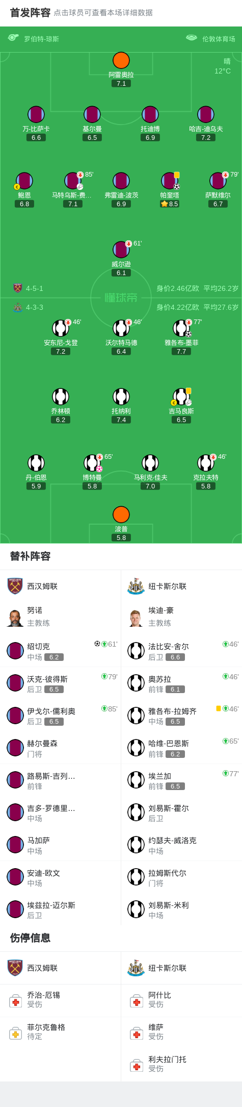 北京时间11月2日,英超联赛第10轮展开角逐,西汉姆联坐镇主场迎战纽卡斯尔联。吉马良斯助攻雅各布-墨菲闪击破门。帕奎塔一记世界波将比分扳平。上半场临近结束前,博特曼不慎自摆乌龙,西汉姆联借此反超比分。下半场,波茨进球越位在先,绍切克补射破门为西汉姆联锁定胜局。最终,西汉姆联3-1逆转战胜纽卡斯尔联。