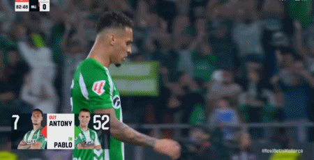 第34分钟,安东尼世界波破门完成梅开二度,贝蒂斯2-0马略卡