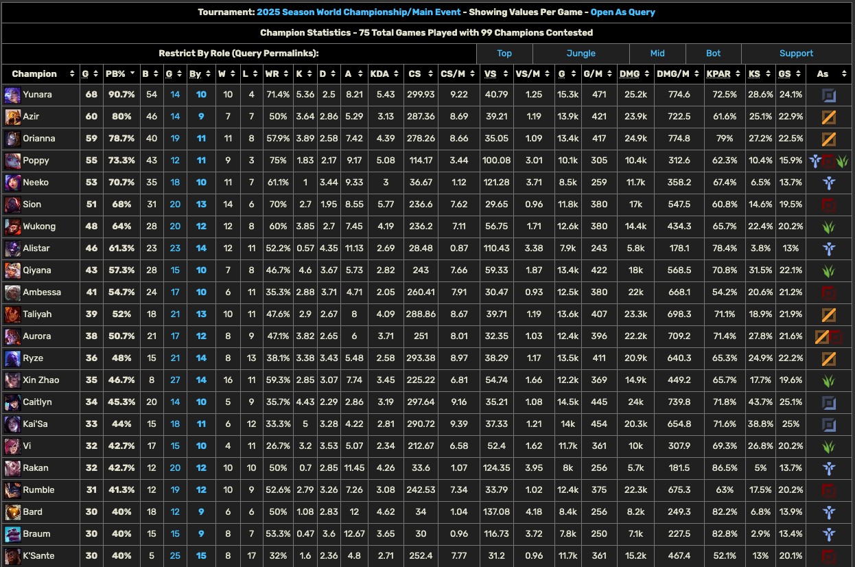 英雄联盟S15世界赛已经进入尾声,11月9日我们将在最终的决赛中见证一场T1与KT的LCK内战。截至目前,芸阿娜成为了S15正赛中BP率最高的英雄,达到90.7%。