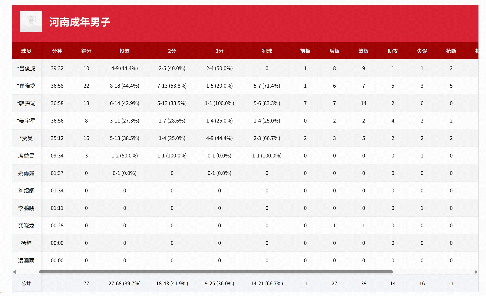河南男篮:崔晓龙22分7板4助4断、韩霈瑜18分14板2助、吕俊虎13分8板1助2断、贾昊13分6板2助2断、姜宇星8分2板4助2断;