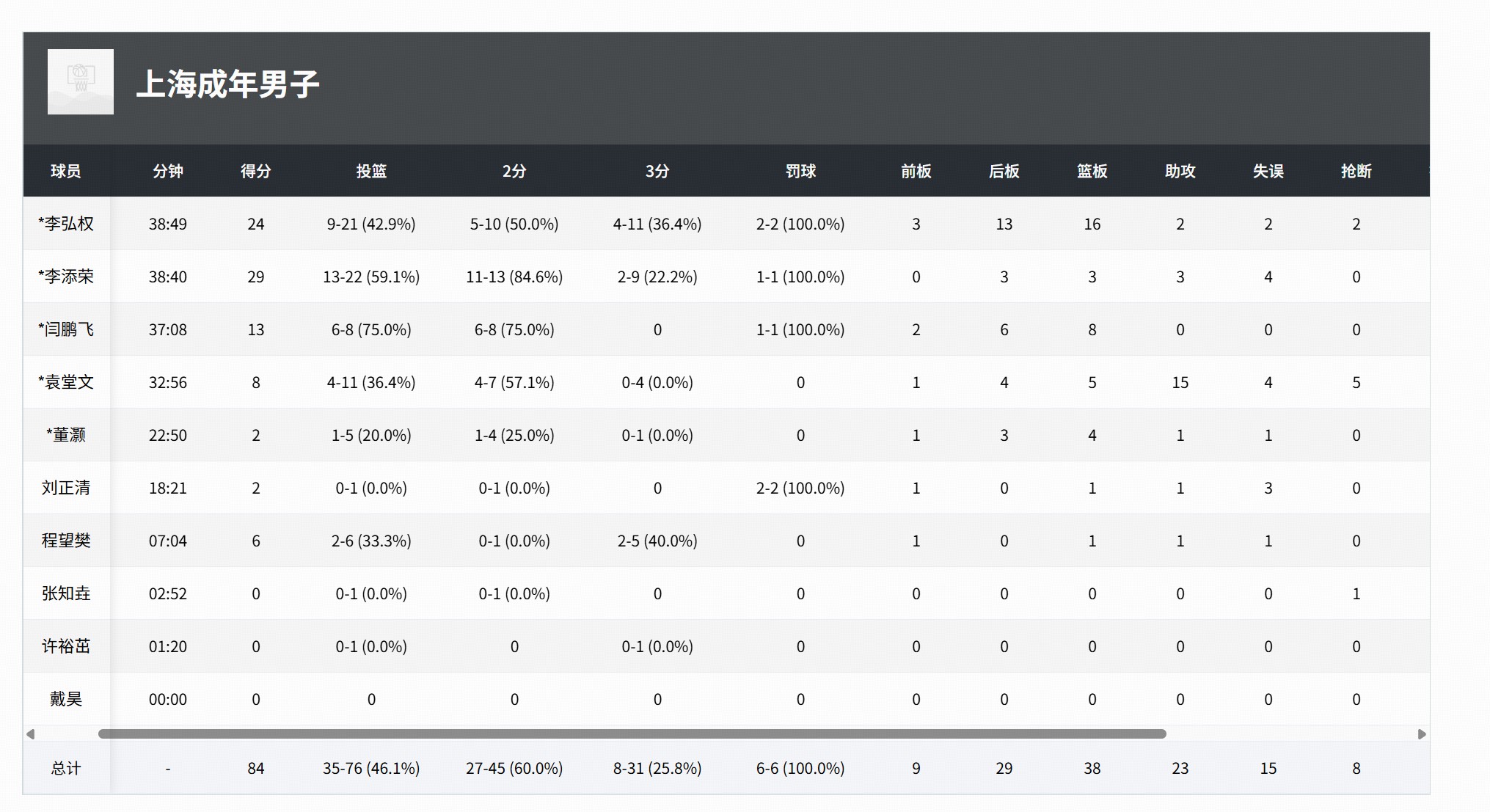 上海男篮:李添荣29分3板3助、李弘权24分16板2助2断2帽、闫鹏飞13分8板2帽、袁堂文8分5板16助5断。