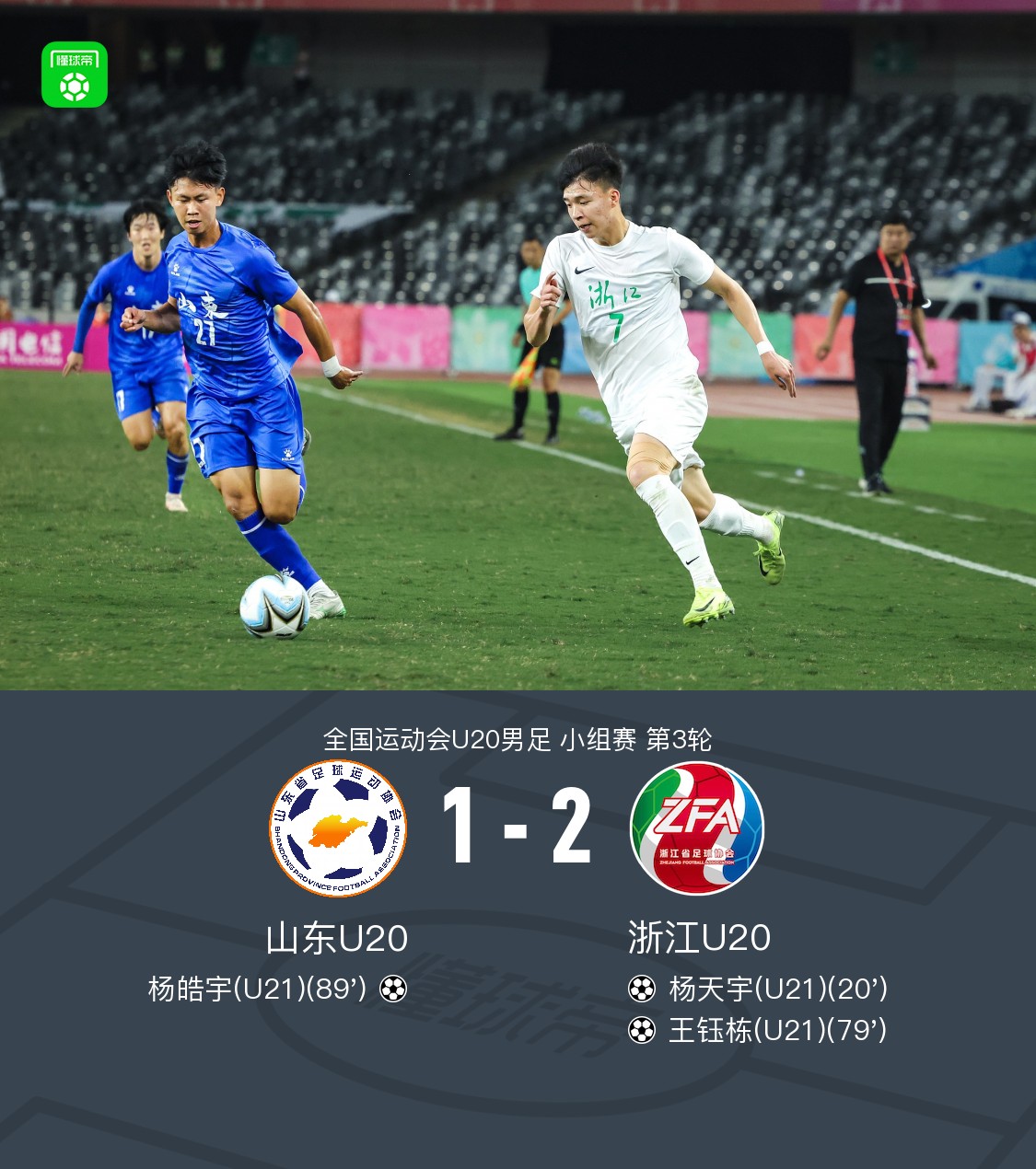 全国运动会U20男足小组赛第3轮,山东U20与浙江U20展开对决。比赛中,浙江U20率先由杨天宇破门取得领先。随后王钰栋再入一球,扩大比分优势。比赛尾声阶段,杨皓宇为山东U20扳回一城。最终全场比分为1-2,浙江U20收获胜利。