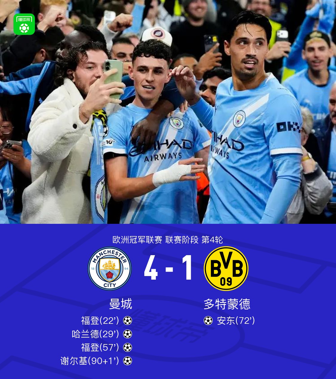 北京时间11月6日,欧洲冠军联赛联赛阶段第4轮展开较量,曼城迎战多特蒙德。比赛中,赖因德斯送出精准传球,助力福登率先打破僵局。随后多库快速推进并完成传中,哈兰德及时包抄破门,为主队进一步扩大优势。易边再战,赖因德斯再度施展妙传,福登冷静施射得手,完成个人第二粒进球。多特蒙德并未放弃,瑞尔森在防守转换中送出助攻,安东抓住机会扳回一城。临近结束,谢尔基在补时阶段果断出击,以一记精准射门锁定胜局。最终全场比赛结束,曼城以4比1战胜多特蒙德。